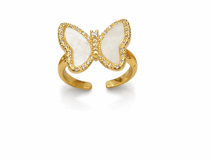 Δαχτυλίδι σε σχήμα πεταλούδας επιχρυσωμένο Κ14 με άνοιγμα στο κάτω μέρος με λευκές πέτρες ζιργκόν και στο κέντρο πετρά φίλντισι σε ανοξείδωτο ατσάλι υποαλλεργικο ένα υπέροχο κόσμημα για να το φοράτε στη καθημερινότητα σας και κατάλληλο για ολες τις επιδερμίδες.
