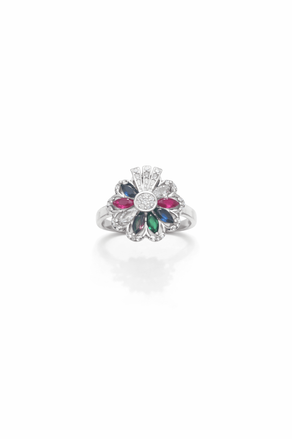 Επιπλατινωμένο δαχτυλίδι Κ14 με  χρωματιστές πέτρες ζιργκόν με πολύ καλό δέσιμο που κρατάει τις πέτρες. Οι πέτρες είναι καρφωτές ώστε να μην φεύγουν εύκολα, υποαλλεργικό ιδανικό για όλες τις επιδερμίδες ακόμη και για τις πιο ευαίσθητες επιδερμίδες.