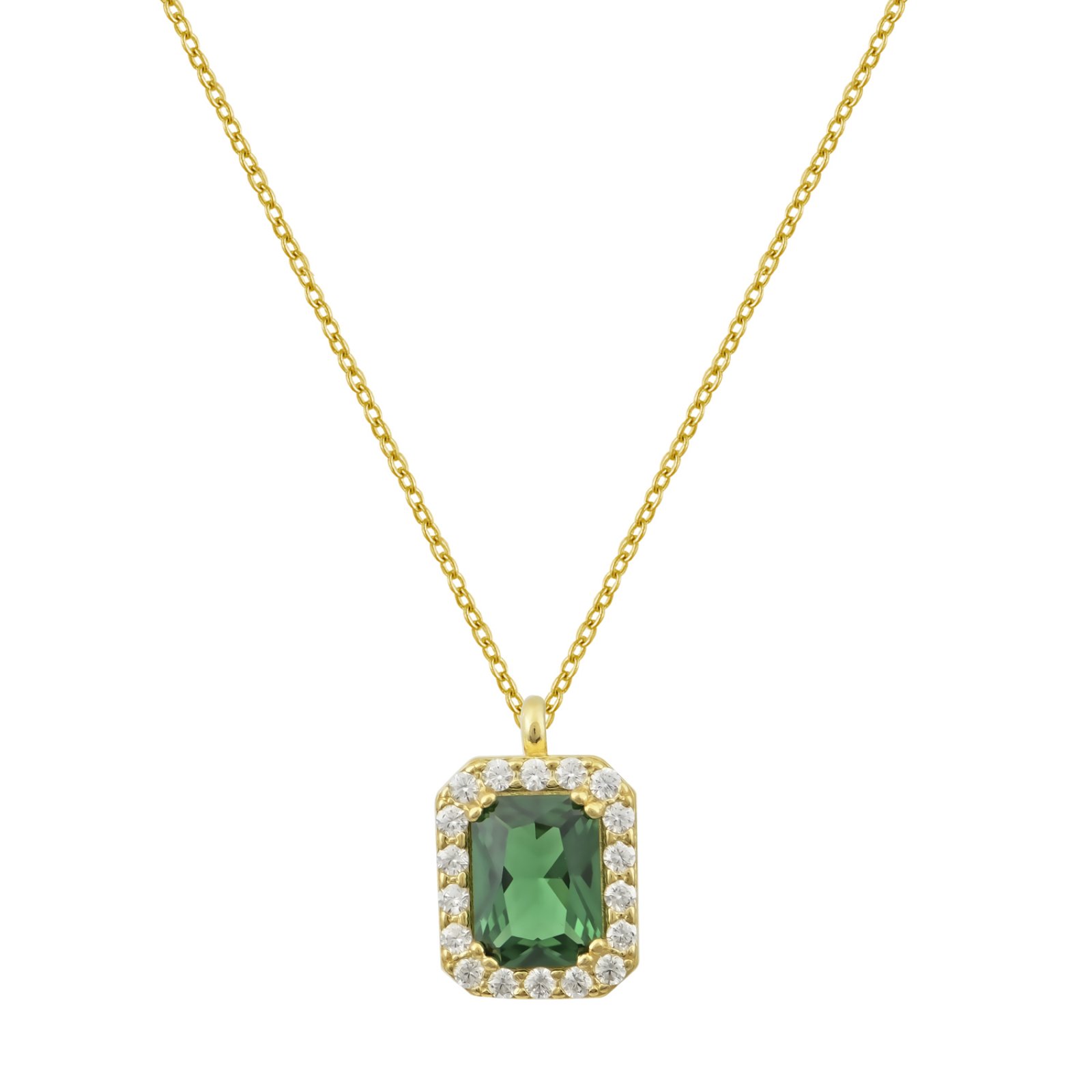Ασημένιο Μενταγιόν επιχρυσωμένο Κ14 με πράσινη πέτρα ζιργκον  στο κέντρο και περιμετρικά λευκές πέτρες ζιργκον  οι πέτρες είναι καρφωτές ώστε να μη φεύγουν εύκολα. Ένα υπέροχο κομψό κόσμημα για να το φοράτε στη καθημερινότητα σας και με ασφαλές κούμπωμα στην αλυσίδα.