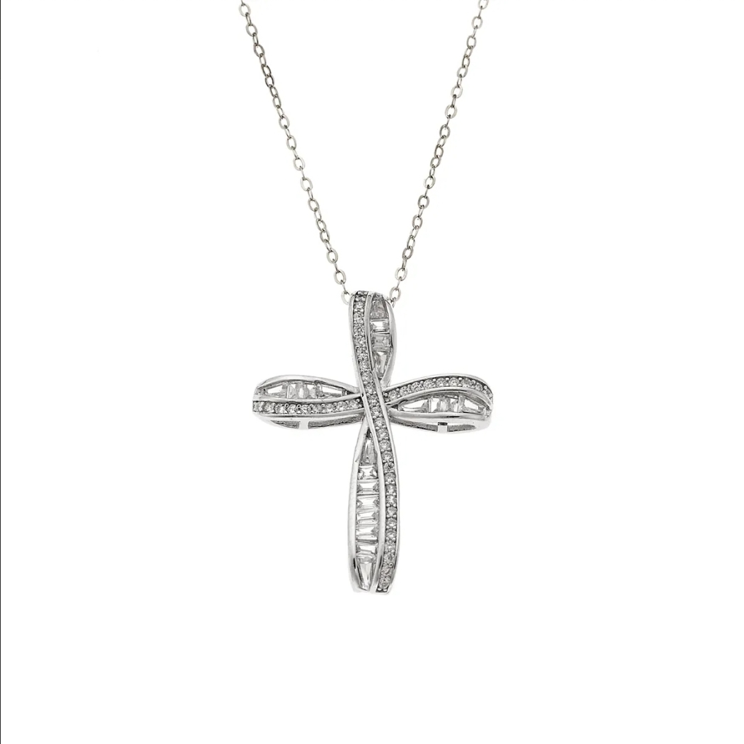 Ασημένιος Σταυρος επιπλατινωμένος Κ14 με λευκές πέτρες ζιργκον. Οι πέτρες είναι καρφωτές ώστε να μη φεύγουν εύκολα. Ένα υπέροχο κόσμημα για να το φοράτε στη καθημερινότητα σας στη τιμή περιλαμβάνετε και η αλυσίδα με ασφαλές κούμπωμα στην αλυσίδα.