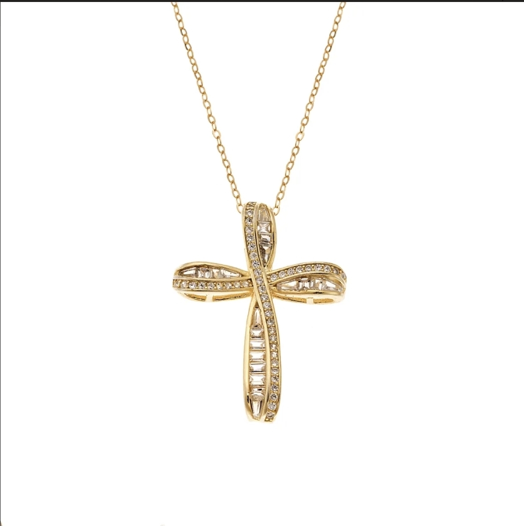 Ασημένιος Σταυρος επιχρυσωμένος Κ14 με λευκές πέτρες ζιργκον. Οι πέτρες είναι καρφωτές ώστε να μη φεύγουν εύκολα. Ένα υπέροχο κόσμημα για να το φοράτε στη καθημερινότητα σας στη τιμή περιλαμβάνετε και η αλυσίδα με ασφαλές κούμπωμα στην αλυσίδα.