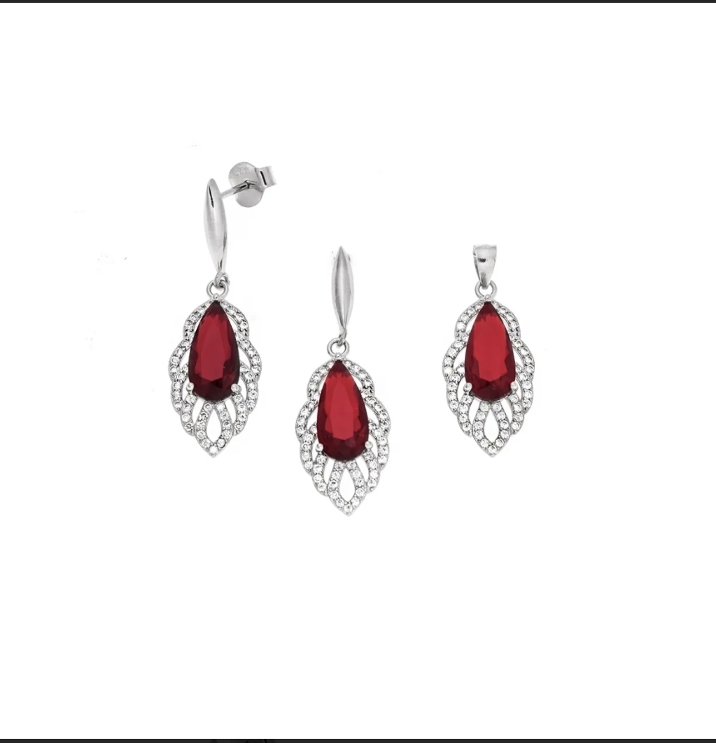 Ασημένιο Σετ μενταγιόν με σκουλαρίκια επιπλατινωμένο Κ14 με λευκές και κόκκινή πετρά ζιργκον στο κέντρο. Οι πέτρες είναι καρφωτές ώστε να μη φεύγουν εύκολα. Ένα υπέροχο κόσμημα για να το φοράτε στη καθημερινότητα σας.