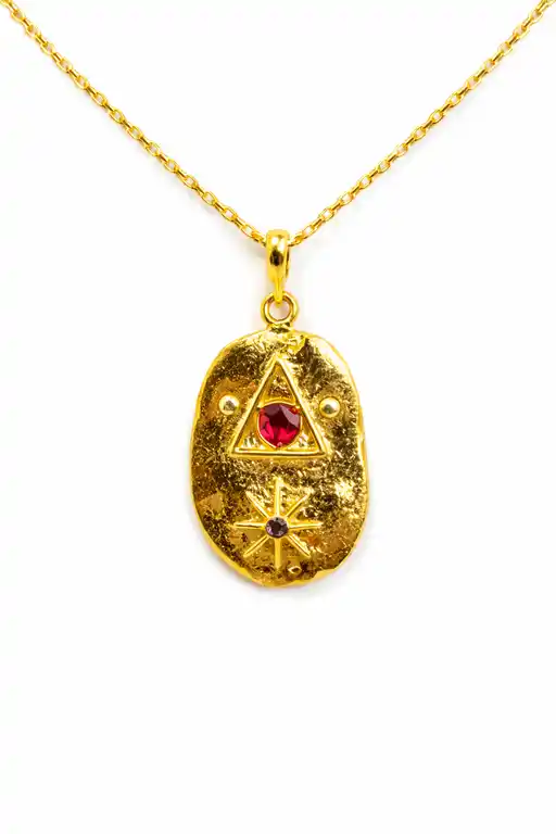 Ασημένιο μενταγιόν 925 επιχρυσωμένο Κ14 σε βυζαντινο στιλ με κοκκινες πέτρες ζιργκόν Ένα υπέροχο κόσμημα για να το φοράτε στη καθημερινότητα σας στη τιμή περιλαμβάνετε και η αλυσίδα με ασφαλές κούμπωμα στην αλυσίδα.
