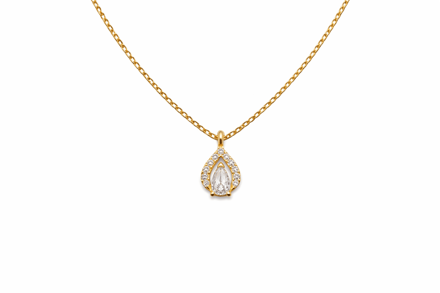 Ασημένιο μενταγιόν 925 επιχρυσωμένο Κ14 με λευκές πέτρες ζιργκόν. Οι πέτρες είναι καρφωτές ώστε να μη φεύγουν εύκολα. Ένα υπέροχο κόσμημα για να το φοράτε στη καθημερινότητα σας.