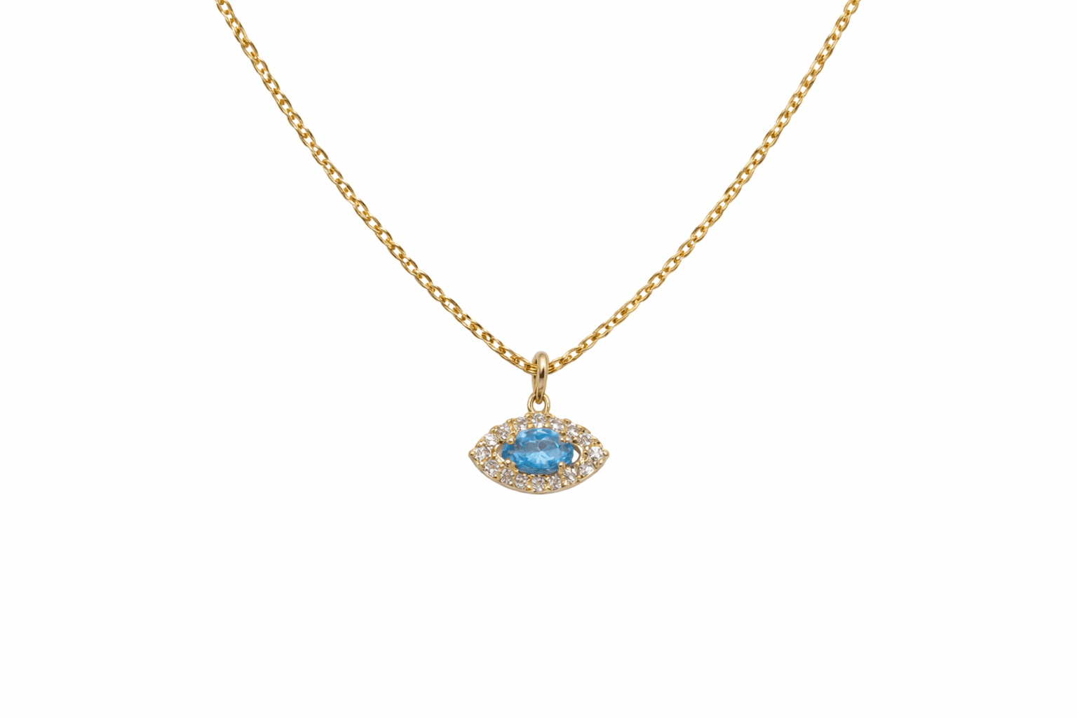 Ασημένιο μενταγιόν 925 επιχρυσωμένο Κ14 με λευκές πέτρες ζιργκόν και γαλάζια πετρά ζιργκόν στο κέντρο. Οι πέτρες είναι καρφωτές ώστε να μη φεύγουν εύκολα. Ένα υπέροχο κόσμημα για να το φοράτε στη καθημερινότητα σας.