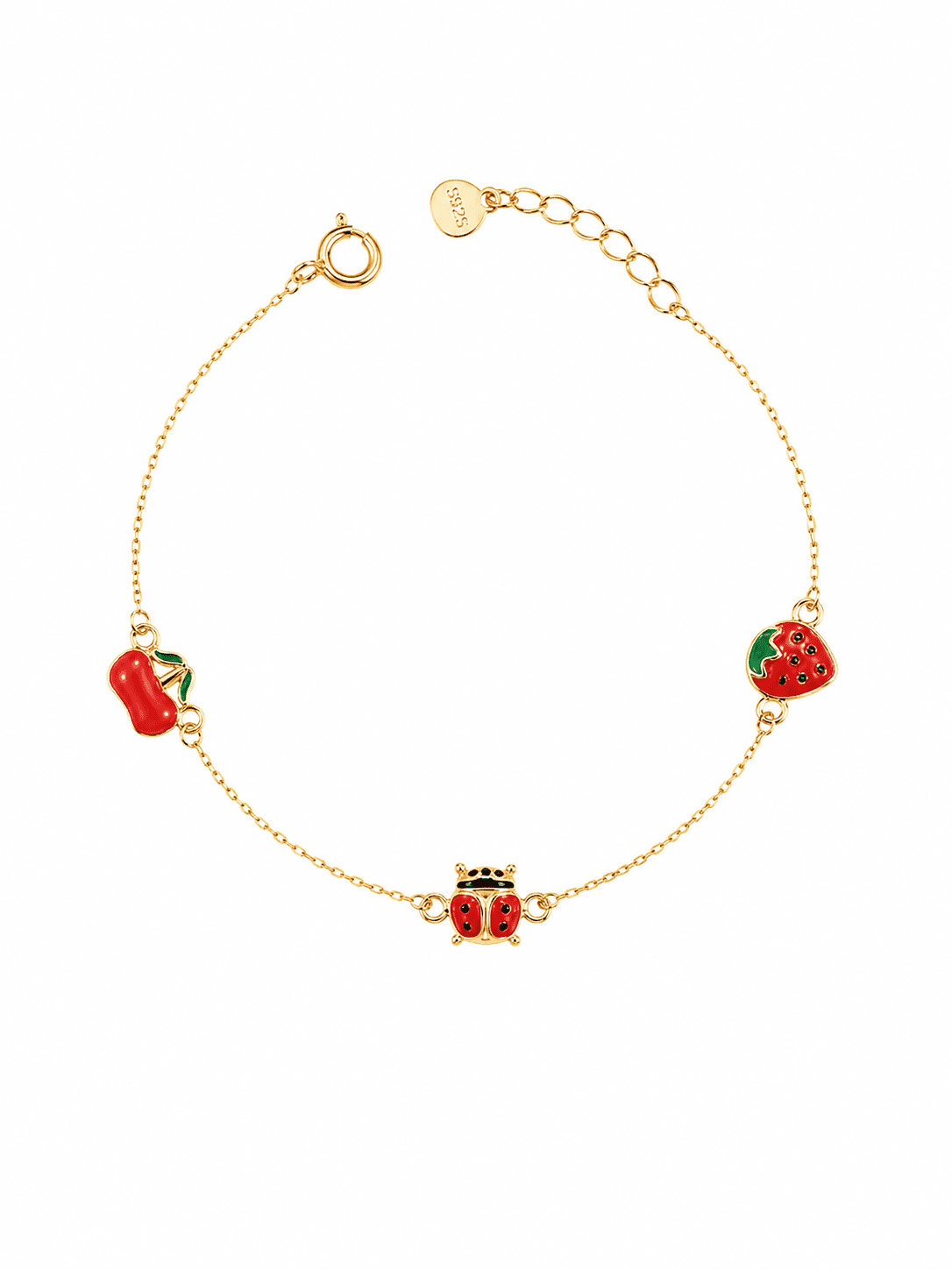 Παιδικό Βραχιόλι επιχρυσωμένο K14 με στοιχεία φράουλα, μήλο και στο κέντρο πασχαλίτσα .Ιδανικό δώρο για νεογέννητα και για όλες τις ηλικίες των παιδιών  Υποαλλεργικό ιδανικό για την επιδερμίδα των παιδιών. Σε όλα τα κοσμήματα μας παρέχετε γραπτή εγγύηση ποιότητας.