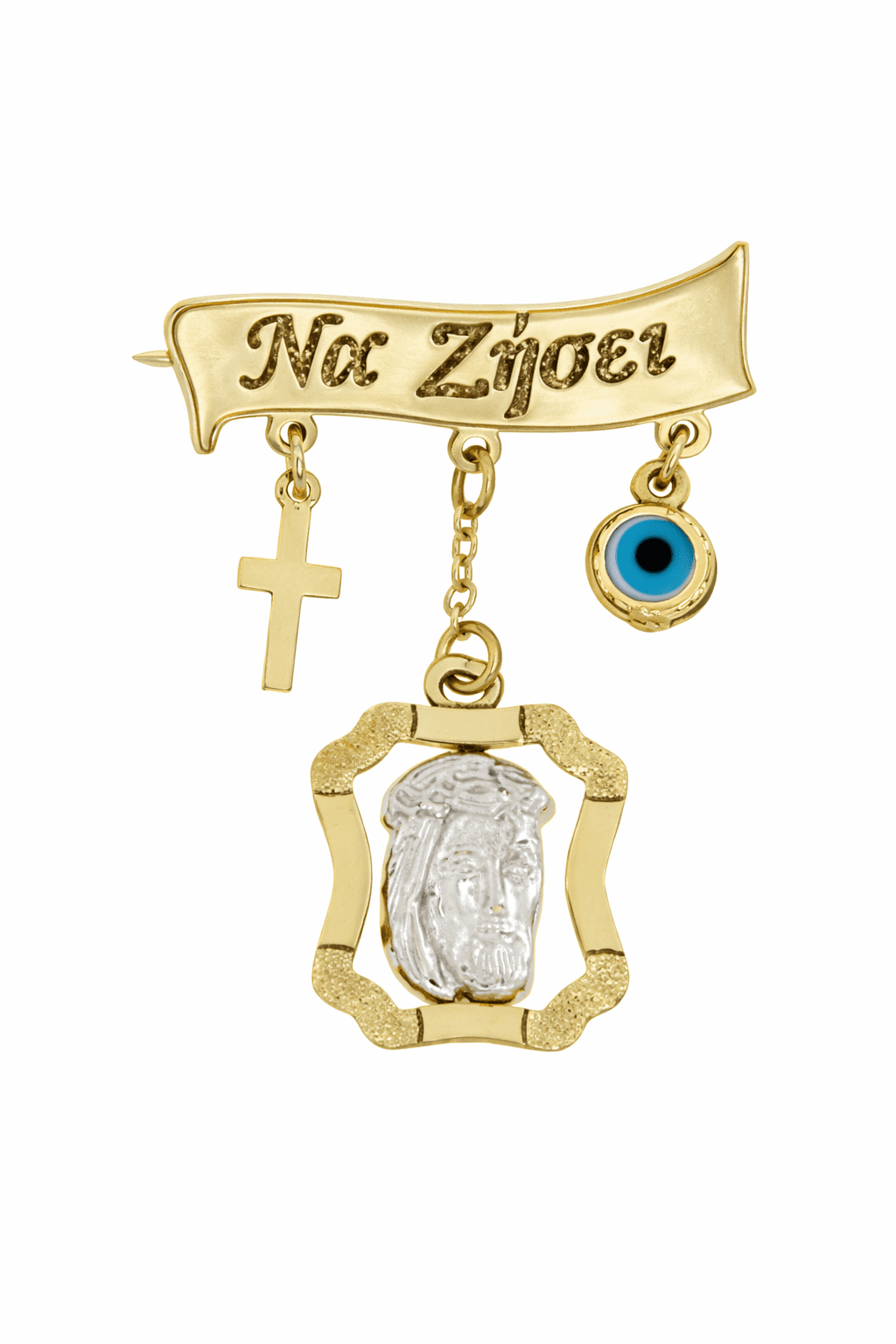 Παραμάνα χρυση καράτια 14 με τη κεφαλή του Χριστού σε λευκόχρυσο καράτια 14 και στο πλάι σταυρουδάκι χρυσο και ματάκι χρυσο. Ένα Ιδανικό δώρο για νεογέννητο αγορι το βάρος του είναι 1.03gr.