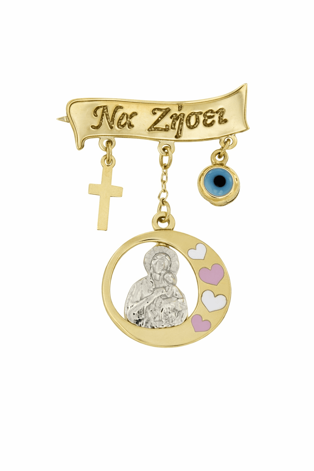 Παραμάνα χρυση καράτια 14 με τη Παναγιά σε χρυσο καράτια 14 και στο πλάι σταυρουδάκι χρυσο και ματάκι χρυσο. Ένα Ιδανικό  δώρο για νεογέννητο το βάρος του είναι 1.03gr.