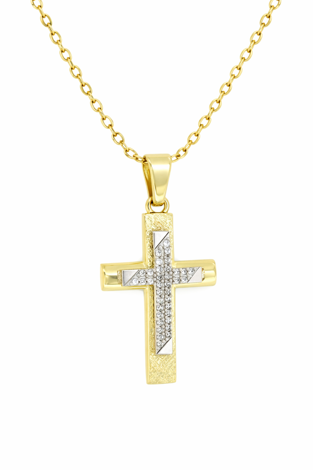 Σταυρός χρυσός βάρος 3.8gr καράτια 14 με πέτρες ζιργκόν δίχρωμος με αλυσίδα 45cm.