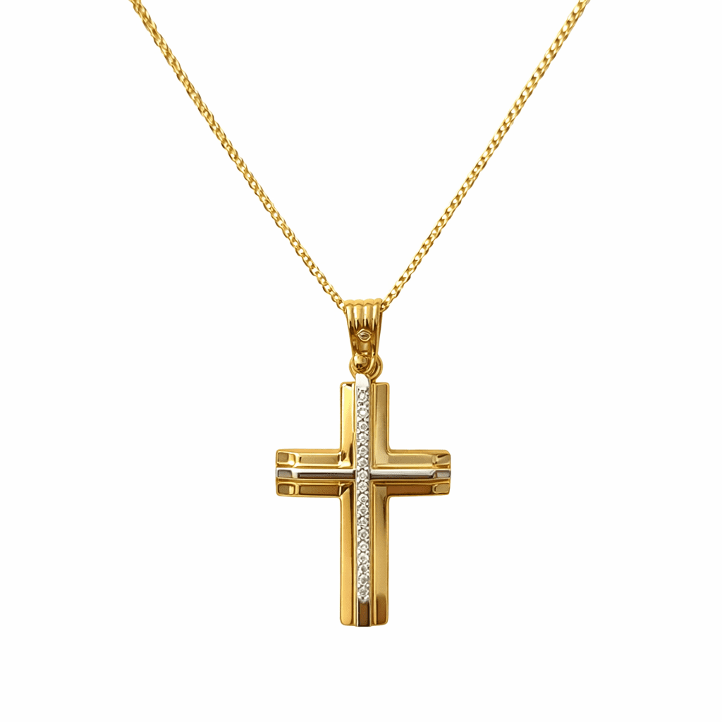 Σταυρός Χρυσός με λευκόχρυσο Καράτια 14 με αλυσίδα χρυση Καράτια 14 και με λευκές πέτρες ζιργκόν πάνω στο σταυρό. Το βάρος του σταυρού με την αλυσίδα είναι 3.4gr και η αλυσίδα είναι 45cm.