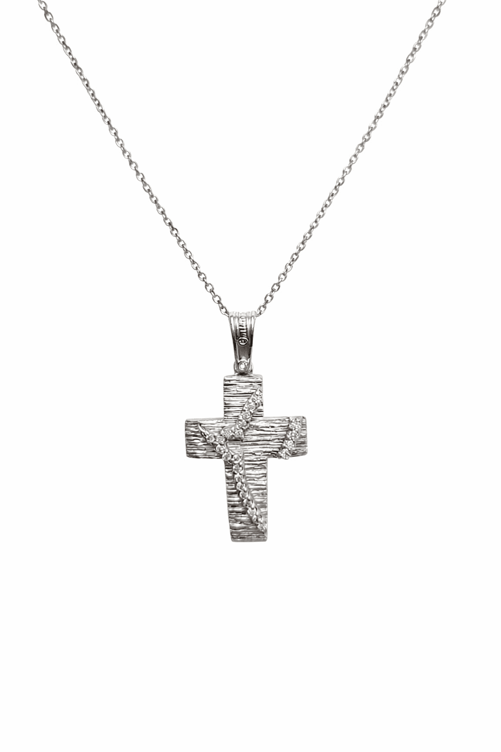 Σταυρός λευκόχρυσο Καράτια 14 με αλυσίδα λευκόχρυση Καράτια 14 με λευκές πέτρες ζιργκόν. Το βάρος του σταυρού με την αλυσίδα είναι 5.4gr και η αλυσίδα είναι 45cm