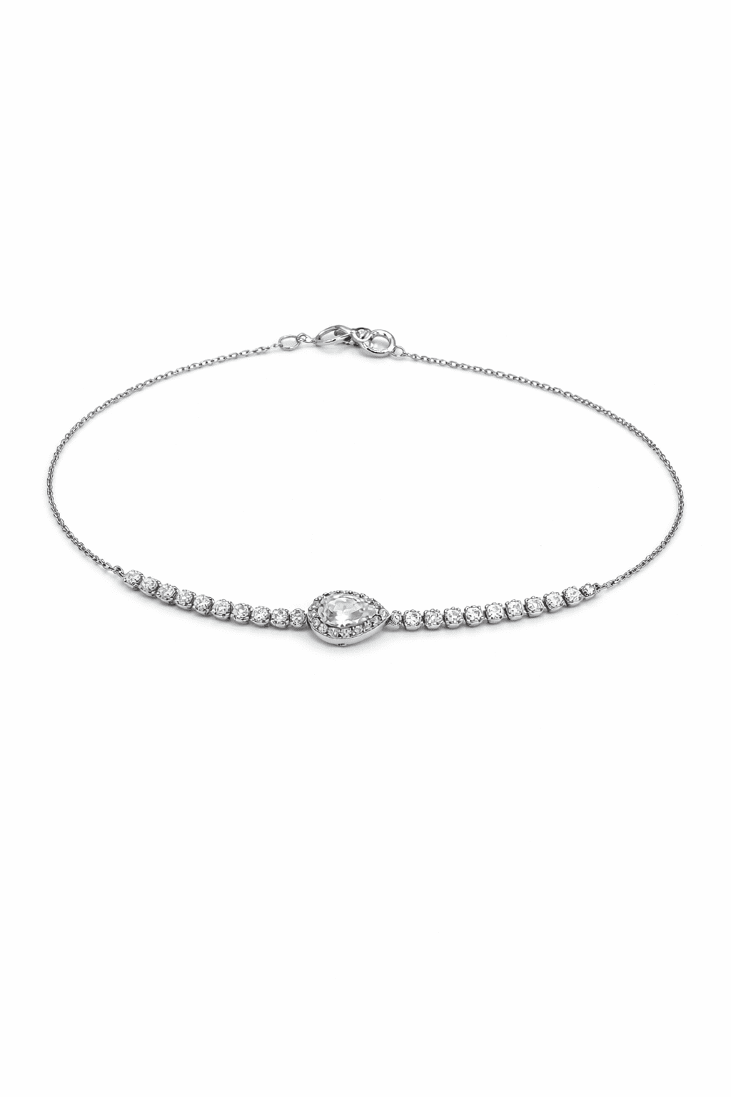 Βραχιόλι λευκόχρυσο με σφραγίδα 585 K14 με λευκές πέτρες ζιργκόν και στο κέντρο εχει λευκή πετρά ζιργκόν σε σχήμα δάκρυ. Ένα υπέροχο βραχιόλι που θα σας εντυπωσιάσει με πολύ καλό κούμπωμα ασφάλειας στην αλυσίδα.